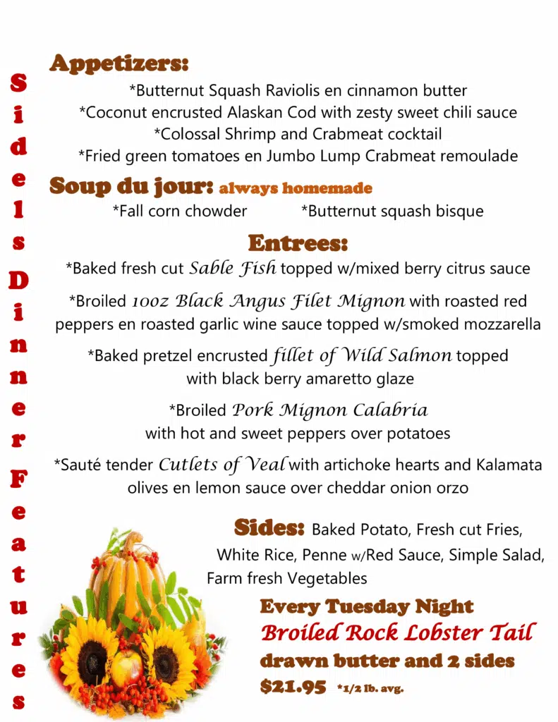 From delicate pasta to premium seafood to NY strip steak, Sidel’s Restaurant has all of your favorite dinner entrees.