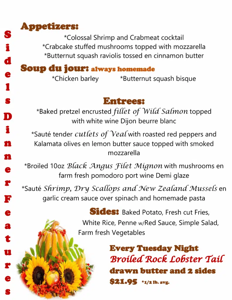From delicate pasta to premium seafood to NY strip steak, Sidel’s Restaurant has all of your favorite dinner entrees.